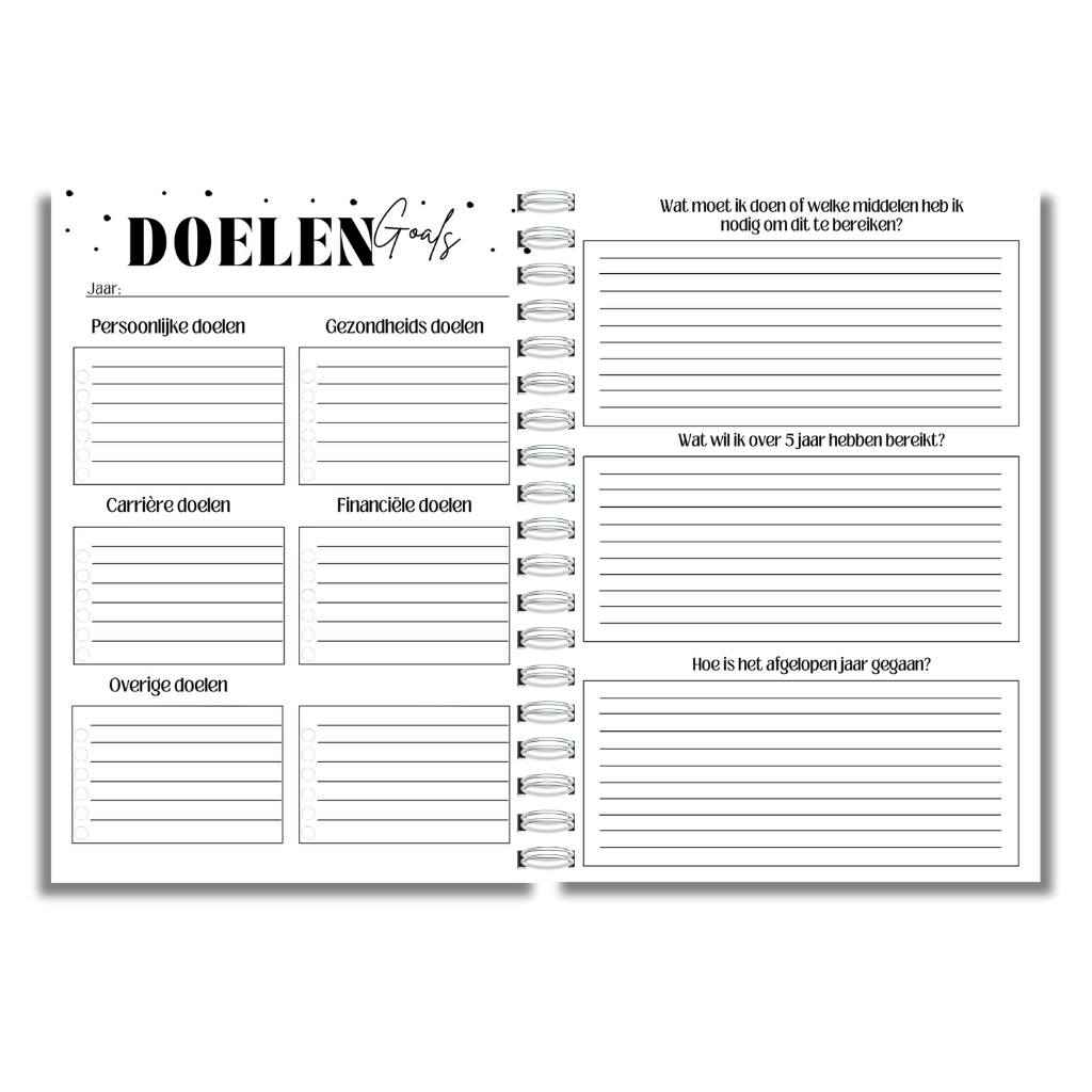 Met een compact A5-formaat van 14,8 x 21 cm past deze planner gemakkelijk in je tas, zodat je altijd en overal aan je doelen kunt werken. Geen gedoe met meerdere boekjes – met deze alles-in-één planner heb je alles wat je nodig hebt binnen handbereik.
