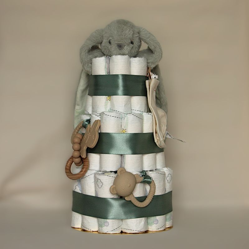 Deze stijlvolle luiertaart is gemaakt van Pampers Premium Protection luiers (14 luiers maat 3, 20 luiers maat 2). De luiers zijn zorgvuldig opgerold en versierd met chique groen lint.