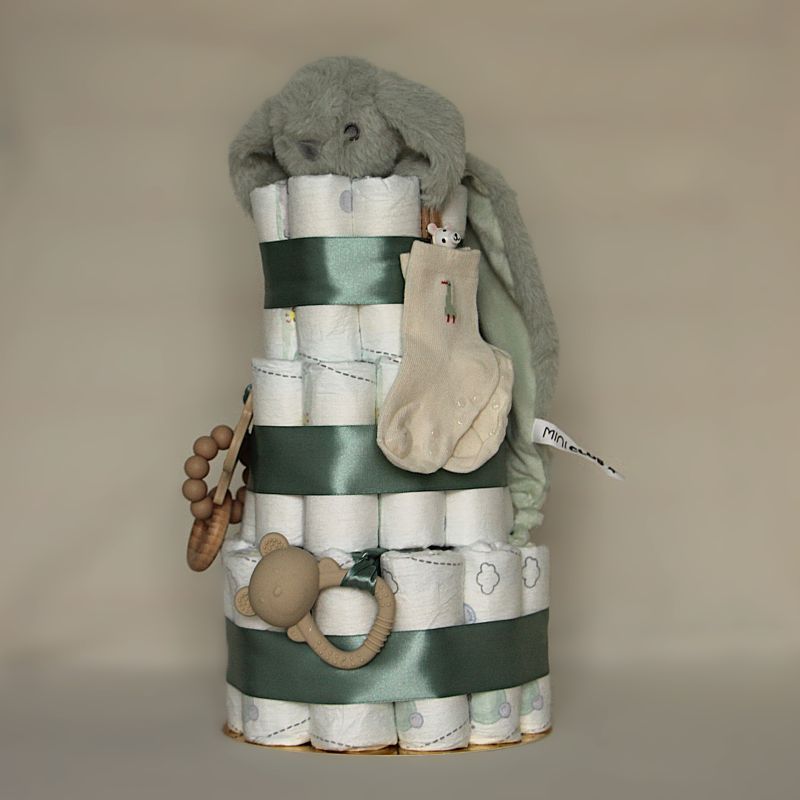 Bovenop de taart zit een groen pluche konijn knuffeldoek van het merk Mini Club , verder zit er een beige bijtring (in de vorm van een konijn) en een beige rammelaar (in de vorm van een beertje) van het merk Eigenwijzzjes en schattige sokjes maat 0-6 maanden van het merk Little Indians bij.